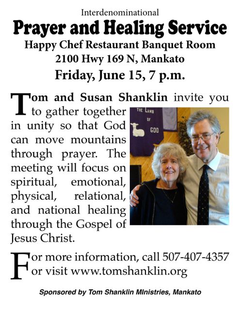 We are excited to let you know about the Tom Shanklin Ministries Interdenominational Prayer and Healing Service on Friday, June 15, at 7 p.m. at the Happy Chef Restaurant banquet room, 2100 Highway 169 North in Mankato. MN. (see map)