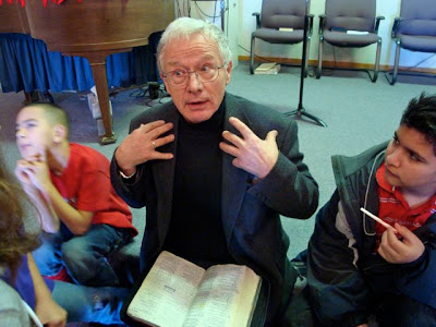 This year he had bypass heart surgery. By the grace of God though, he is doing well, and we are expecting him to have a long and fruitful time of life and ministry. The photo below, which was taken a couple years ago, is typical of Pastor Bob with the children, ever the teacher.