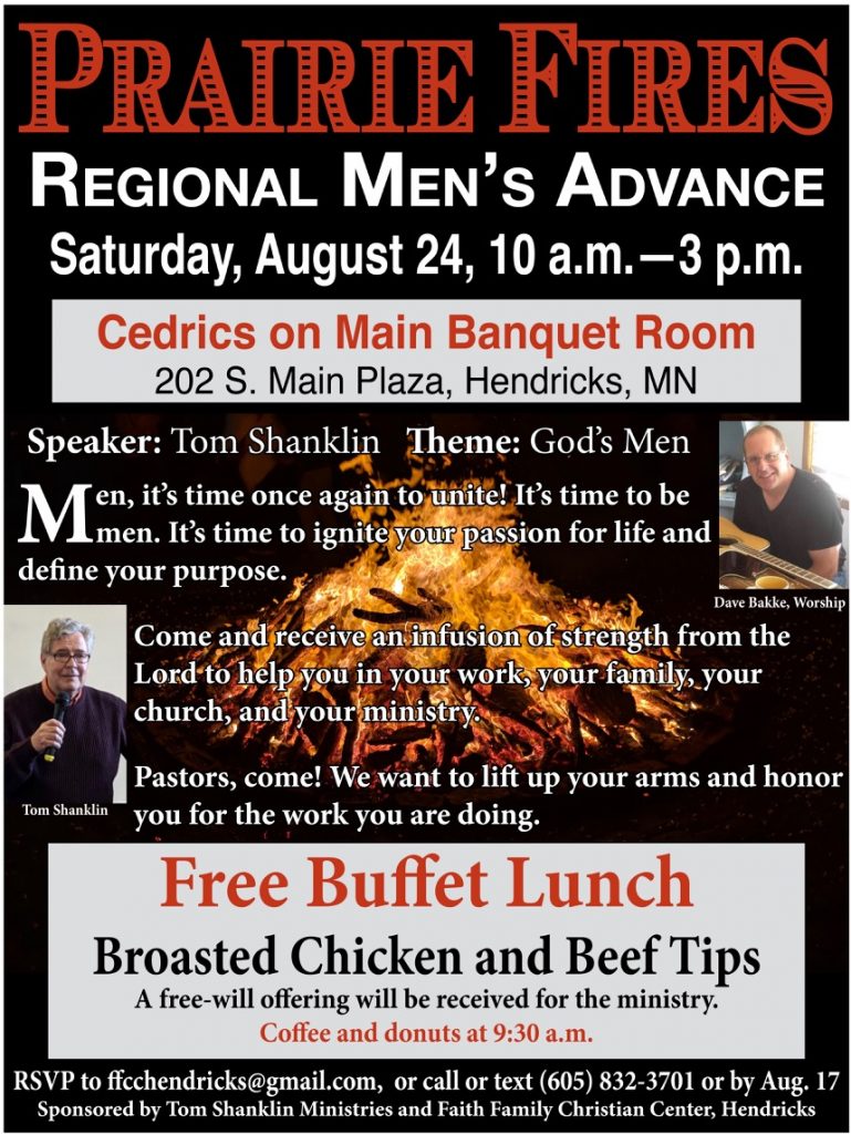 On Saturday, August 24 from 10 a.m. to 3 p.m., we are collaborating once again with Faith Family Christian Center for our Prairie Fires Men’s Conference at Cedrics Supper Club in Hendricks, Minnesota. Men, mark your calendar and plan to attend. Last year, we had men from northern and southern Minnesota, South Dakota, and North Dakota, The theme this year is “God’s Men.” We are excited about lighting a fire that will burn in the men’s families, churches, and communities!