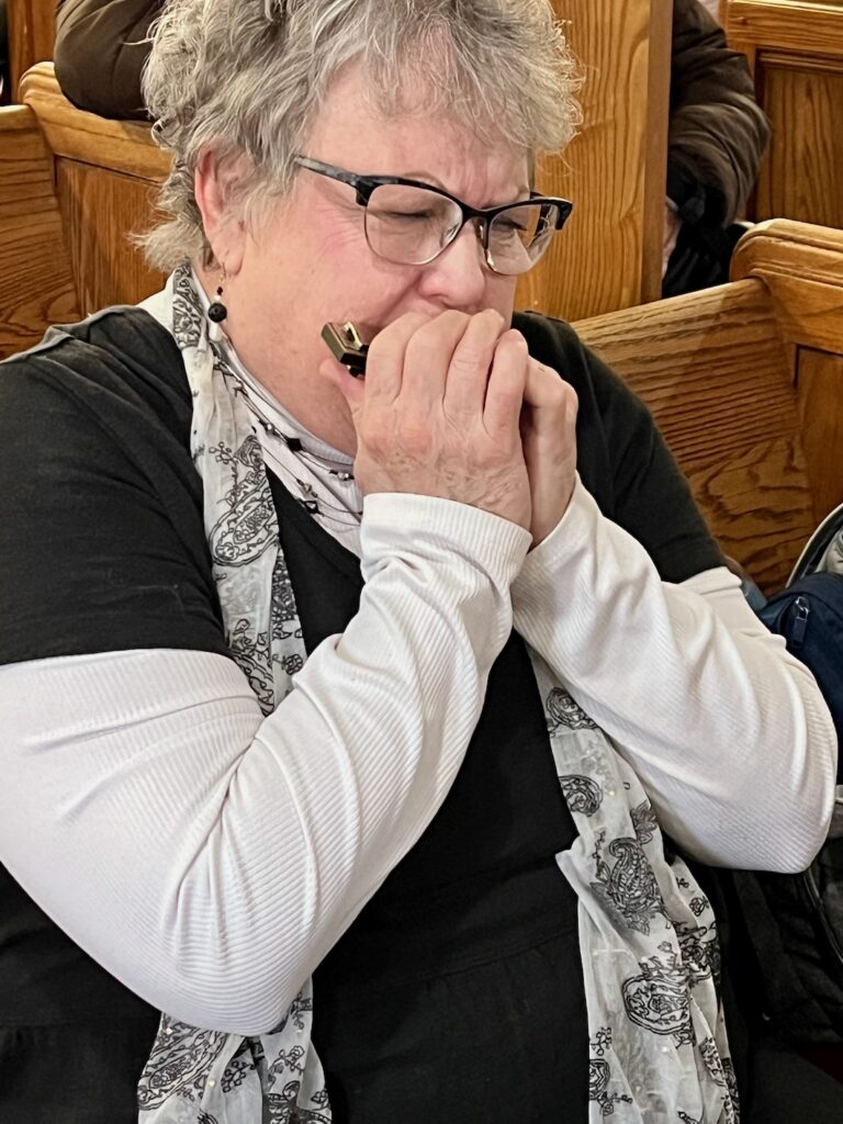 Playing harmonica at Solon Springs.