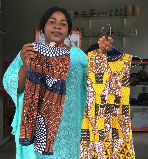 Hortense Clossou with some of the clothing that’s being produce at the Tabitha Sewing Center.