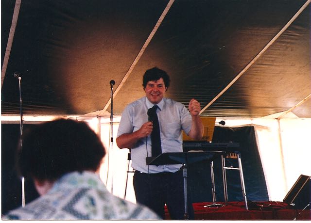 Tom preaching in the tent in the ’80s.