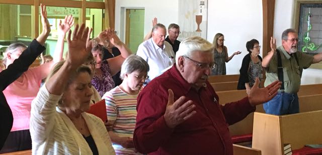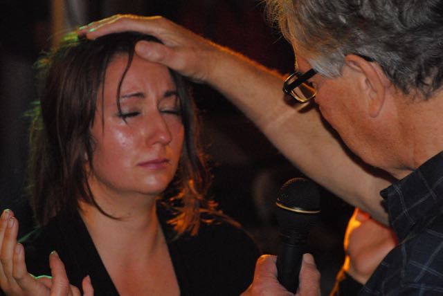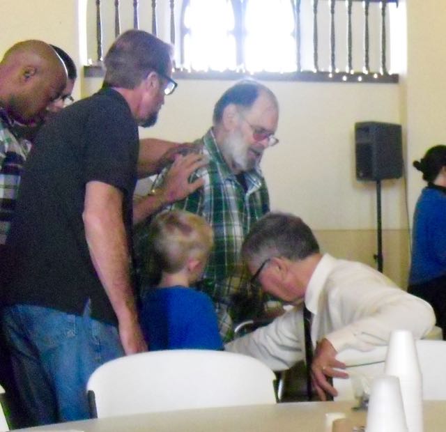Tom ministering to the sick at Community-wide Healing Service, Cresco, Iowa.