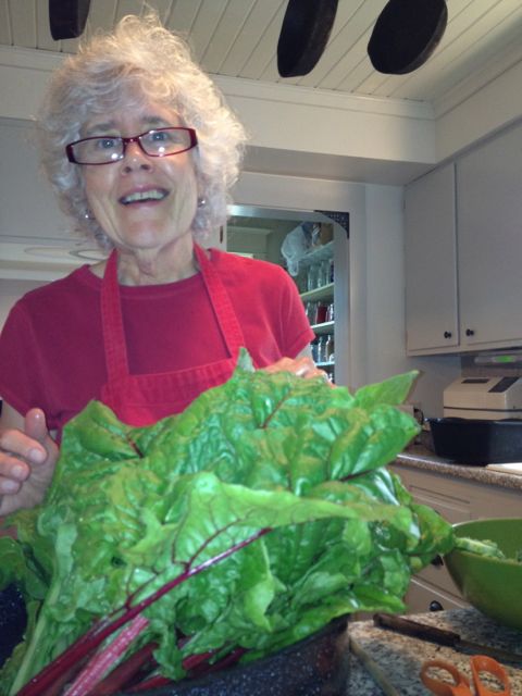 Tom and I will eat it with our eggs in the morning or have it for lunch or dinner but the true destiny of most of our chard is the freezer. I go out to the garden and pick a leaf or two off of each plant and wash, blanch in hot water, chill, spin out the water, and pack in freezer bags. Later, I will take them out in the winter for summer-like taste bud heaven.